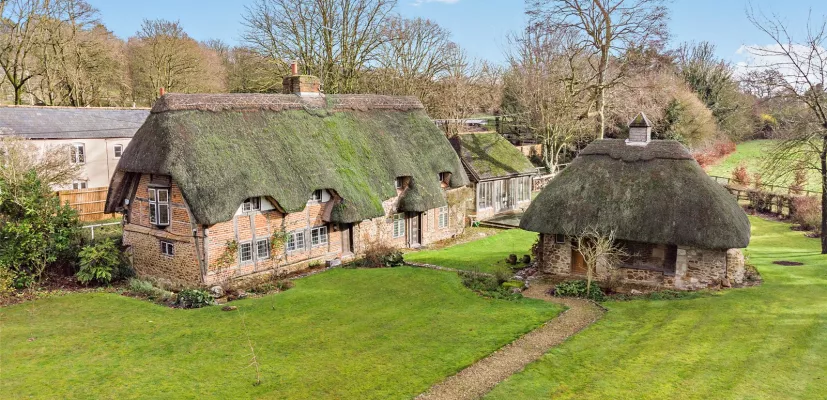 A charming Grade II listed thatched cottage with large garden, detached outbuilding and garage