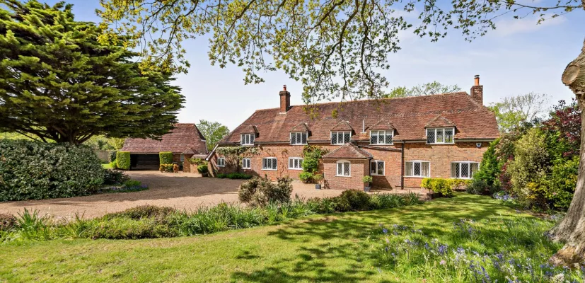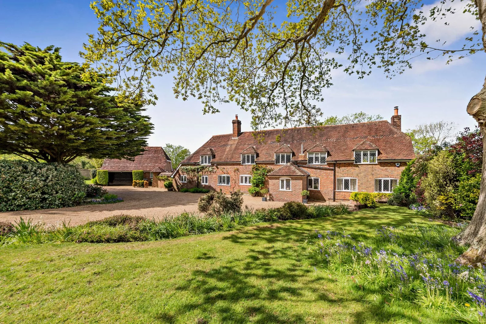 Titlarks Farm is believed to date back to the 1600s and was extended in the 1970s. This is only the second time in some forty years that the house has been on the market. An attractive Flemish brick built home with tiled roof, the rooms are well proportioned and bright and have a wealth of features typical of a house of this era, with areas of exposed brick and some beams, although these do not dominate the spaces. The house is well proportioned, with the main house offering 3838 sq ft of accommodation over two floors. Unusually for a house of this age, the ceiling heights are generous. During the work in the 1970s the floors were lowered. The welcoming entrance hall has plenty of character, with flagstones leading you to the reception rooms. A lovely drawing room is found at the back of the house, an elegant room, which has French doors out onto the terrace and the dual aspect enjoys both the light, views of the garden and countryside beyond. There is a snug, which has an impressive brick fireplace with a wood burning stove and wooden floors follow through into the formal dining room where this generous room has French doors out onto the terrace and pool area. The kitchen/breakfast room has been upgraded in recent years, and is now an excellent "cooks kitchen" with a central island and bespoke cabinetry and high end integrated appliances, including a dual control electric Aga. There is also space for a breakfast table. There is a useful utility room adjacent to the kitchen, along with a shower room which is conveniently placed for access out to the terrace and swimming pool. The ground floor accommodation also has a further sitting room, with an impressive brick fireplace and wood burning stove, and built in cupboards and shelving. The study has a built in cupboard and bookcases. The first floor has a wonderful open landing, adding to the feeling of space. The principal bedroom is to the rear of the house and has a wonderful view across the gardens and countryside beyond. It also has an en suite shower room and a walk-in wardrobe. There are two further bedrooms, both with en suite bathrooms, and a further two bedrooms that share a family bathroom. All the bedrooms have built in storage.