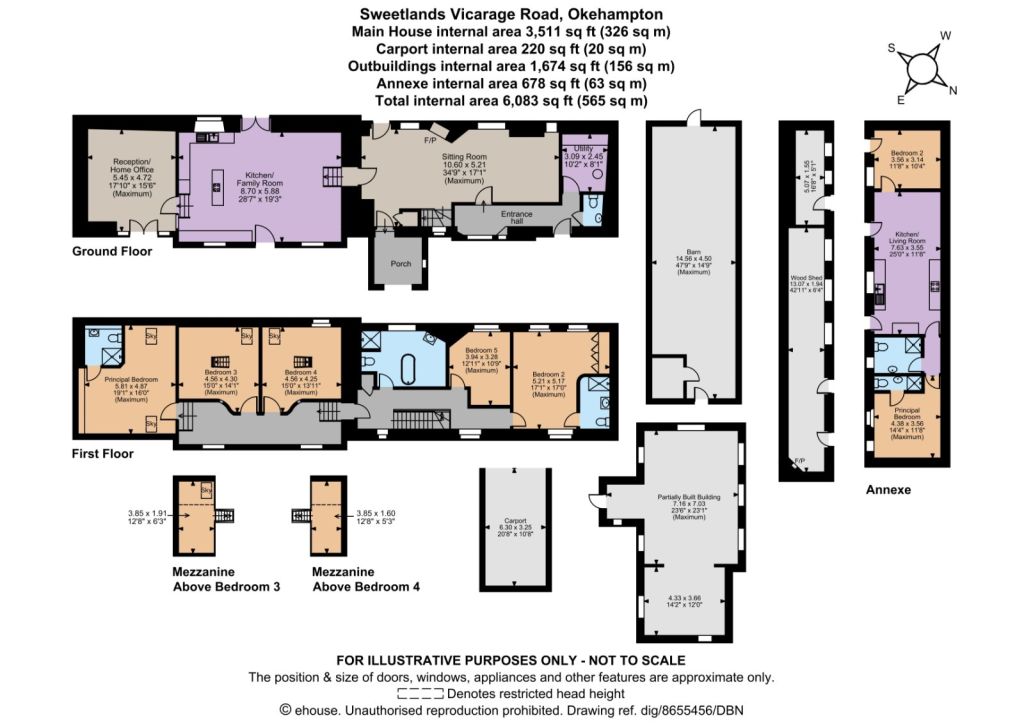 An oak staircase rises from the sitting room to the part-vaulted split-level first floor where there are five double bedrooms. The generous principal bedroom has skylights overhead and an en suite shower room while one further bedroom also benefits from en suite facilities. Two bedrooms feature stairs rising to mezzanines. The fifth double bedroom is next to the family bathroom with a freestanding bath and separate shower unit.