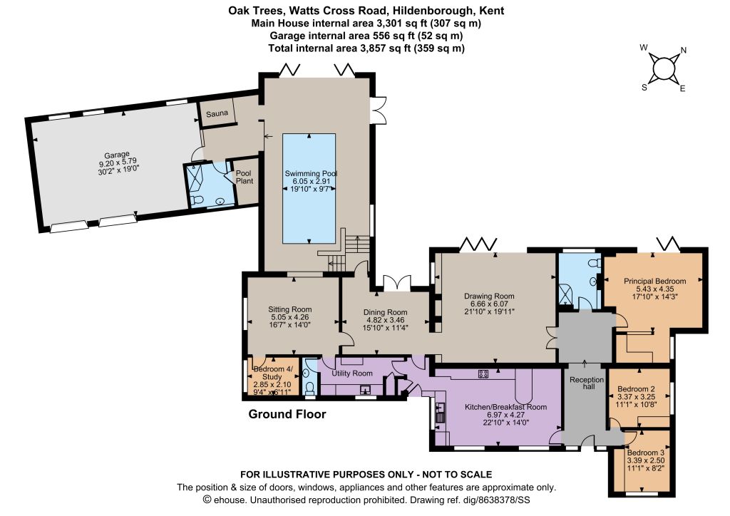 There are four well-presented bedrooms, all of which are easily accessible on the ground level. They include the principal bedroom with its dressing room and bi-fold doors opening onto the gardens. The property also features two shower rooms. The jewel in the crown of the home is the relaxing spa with its swimming pool and sauna, as well as a seating area with bi-fold doors opening onto the gardens.