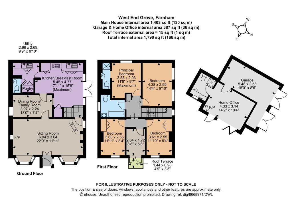 On the first floor, a split-level landing gives access to a rear aspect principal bedroom with en suite shower room, three further bedrooms, two with built-in storage, a family bathroom with a bath with shower over and a further room with French windows to a front aspect roof terrace, currently used as a study but suitable for use as an additional bedroom, if required.