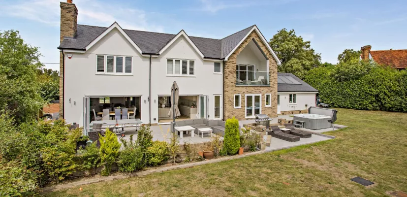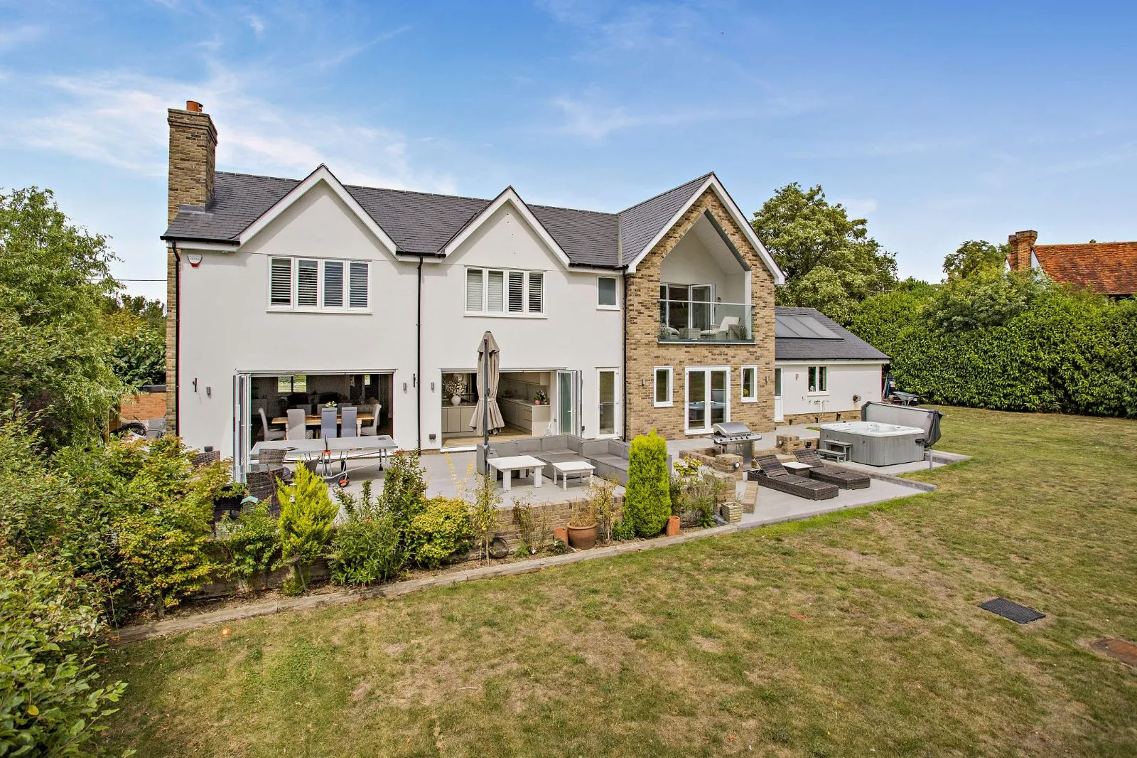 The well-maintained enclosed garden to the rear is laid mainly to level lawn bordered by mature hedging and trees. It features a vaulted garden room with a bespoke bar, en suite cloakroom and bi-fold doors to a paved, part pergola-covered terrace together with a large paved terrace with hot tub area, accessible from the rear aspect rooms and ideal for entertaining and al fresco dining. The whole enjoys far-reaching views over neighbouring countryside.