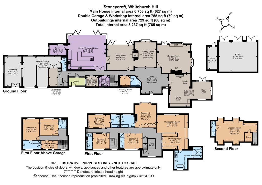Stoney Croft is a unique and significant Arts & Crafts inspired 1930s country house that has been significantly altered and improved by the current owners during their 15 year ownership. With a commanding position to appreciate stunning views, it's conveniently located on the edge of the pretty Oxfordshire village of Whitchurch on Thames, well connected for transport links and close to pubs, shops and other facilities. Downstairs, what was historically a rather impractical layout has been re-imagined to now offer four, distinct, spacious and flexible reception rooms, of which three capture those rear facing views. The more formal drawing room with feature fireplace measures over 500 sq ft and the current dining room has bifold doors out onto a terrace. There is sizeable open plan, contemporary kitchen with a long, 'L shaped' central island, Gaggenau steam oven, stainless steel Wolf range cooker, large American Sub-Zero fridge/freezer and a walk-in pantry. Nearly the entirety of the rear wall of the kitchen consists of a bi-fold doors that when open lead directly onto a raised terrace for perfect outdoor dining. As well as separate boot and utility rooms, next to secondary access is a back hallway providing direct access to a double garage, boiler room and large workshop and store. A back staircase from this hallway leads upstairs to two bedrooms, two bathrooms and a dressing room which have a useful privacy and independence from the main house whether for staff, teenage children or longer staying guests. Upstairs there are five double bedrooms on the first floor, all with en-suite bathrooms. The principal bedroom is notable for a walk-through dressing room area and grand en-suite bathroom with a large shower and separate bathtub. The second floor was more recently converted to now provide over 550 sq ft with a shower en-suite, storage space and potential to be a playroom, bedroom or very grand dressing room.