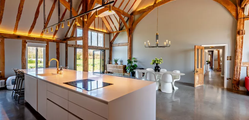 This Grade II* listed building, dating back to the 16th century, was originally an agricultural structure of exceptional interest. It exemplifies early brick nogging and late crown post construction. Brick nogging, a costly material at the time, was used selectively in a flamboyant Tudor style on the southeast and east-facing elevations. This barn is the sole remaining structure of a manorial complex. Sir Thomas Josselyn likely built the complex, which included a large brick-lined moat, an E-plan house with a two-story porch, and a court-hall, shortly after 1544. The ground floor features four reception rooms alongside an impressive open-plan kitchen/breakfast/family room. This area boasts solid concrete flooring, bi-folding doors opening to the garden, and striking ceiling heights with a feature crown post. An impressive entrance hall, cloakroom, utility room, and laundry room complete the ground floor.