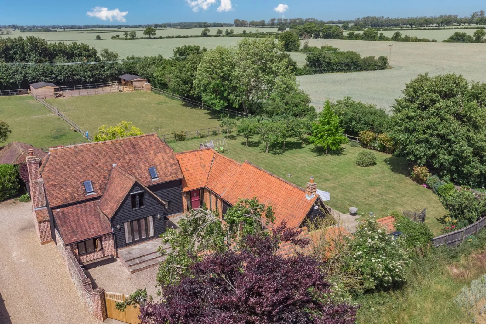Tarbets is an attractive weatherboarded and red brick property offering more than 2,600 sq. ft. of flexible accommodation arranged over two floors in a U-shaped configuration around a central courtyard, designed to provide an ideal family and entertaining space. The ground floor accommodation flows from a welcoming through reception hall with useful cloakroom and comprises a large sitting room with a brick inglenook fireplace with woodburning stove, French doors to the garden and inner courtyard. There is also a generous dining room, a well-proportioned office and two double bedrooms with a neighbouring family bathroom. The ground floor accommodation is completed by an extensive kitchen/breakfast room with neighbouring fitted utility room with Belfast sink, contemporary family shower room and doors to the courtyard and to a further vaulted double bedroom with wooden flooring, built-in storage and French doors to the courtyard, making it suitable for use as a selfcontained annexe if required. The kitchen offers a range of bespoke wall and base units including a large central island with breakfast bar, quartz worktops and splashbacks, a double Belfast sink and an Aga. Stairs rise from the sitting room to the first floor galleried landing with generous vaulted study area, leading to a large principal bedroom with modern vaulted en suite bathroom with freestanding slipper bath and an additional L-shaped double bedroom with modern en suite shower room