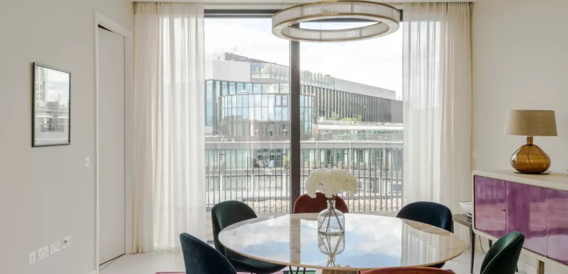 The west-facing principal bedroom features a generous walk-through wardrobe and large en-suite bathroom and the second bedroom also benefits from built in storage. The flat has underfloor hearing and comfort cooling throughout.