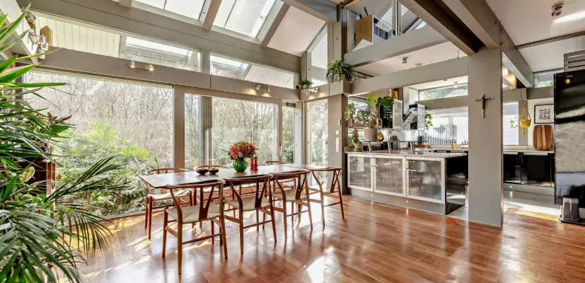 4 Treetops is part of a small gated development of only four properties. Built in 2007, this striking modern property features a post and beam structure that embraces open-plan living and offers a versatile layout perfect for contemporary lifestyles. The accommodation is arranged over three floors and is incredibly flexible in configuration. The home is flooded with natural light, courtesy of expansive windows that frame views of the garden and surrounding woodland. Cherrywood floors flow through the ground floor. Of particular note is the ground floor living space, which is open plan but with well defined areas. The kitchen, by Intoto, has been fitted with sleek units, granted worktops and integrated appliances, along with a glass breakfast bar, which seperates the kitchen from the dining space, here the impressive double height ceilings and expanse of glass drench the space with light, the room opens up into the sitting area, which has a feature woodburning stove. Sliding doors open this space into the covered balcony where there is a superb seating area from which to enjoy the view over the garden and woodland beyond. There is a further snug room which has sliding doors out onto a private terrace and an adjacent shower room which could be used as a further bedroom if required.