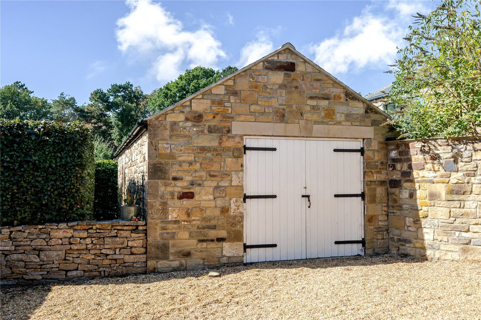 To the side and rear of the house there is a gravelled courtyard providing extensive parking for multiple vehicles and to the two tandem garages. To the front is a large stone flagged terrace with a pergola creating a sheltered dining area.
