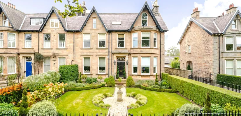 Outside Set behind wrought iron railings and a beautifully manicured formal garden, a gravel pathway guides you to a central stone pedestal that is flanked by lush greenery and continues onto the front door. Hedges form clean, geometric lines around the space and encloss the rich and vibrant flower beds.